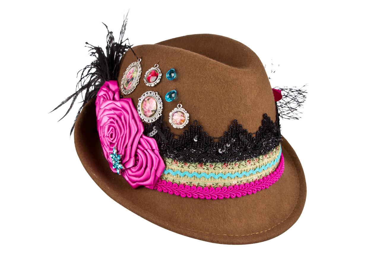Lina Schiller hat den Trachtenhut für Damen neu interpretiert und es geschafft das Cross-Over-Konzept aus Tradition und Moderne mit Strass und Federschmuck gekonnt in Szene zu setzen.