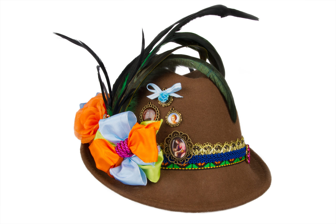 Lina Schiller hat den Trachtenhut für Damen neu interpretiert und es geschafft das Cross-Over-Konzept aus Tradition und Moderne mit Strass und Federschmuck gekonnt in Szene zu setzen.